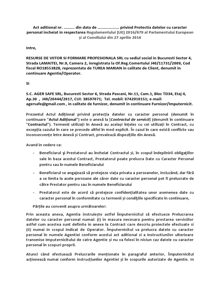 Act Aditional Protectia Datelor Cu Caracter Personal