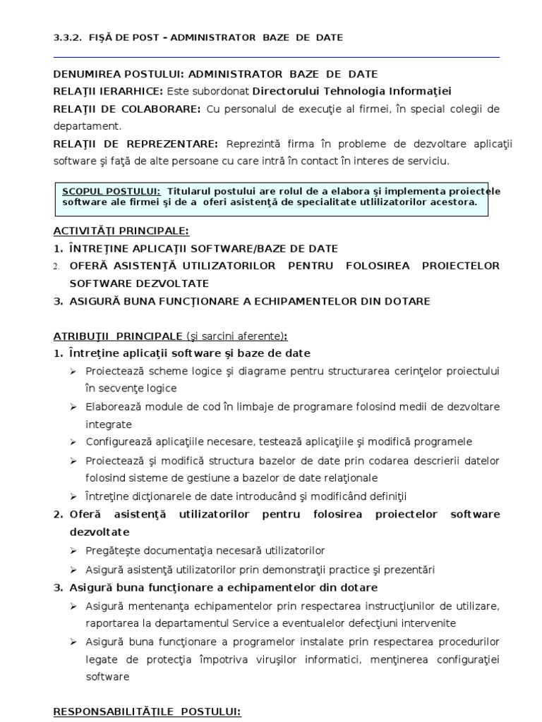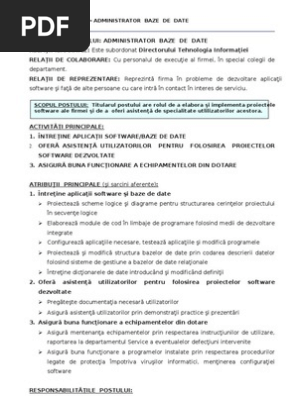 Fisa Postului Pentru Administrator Baze De Date Pdf Bani Si Afaceri