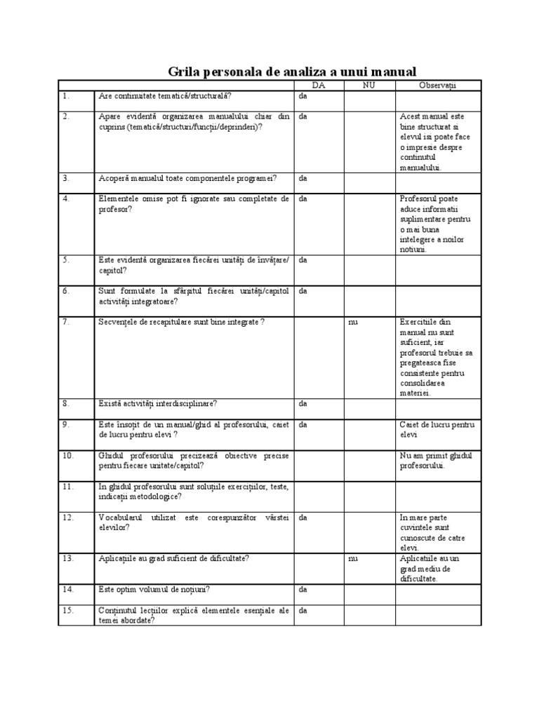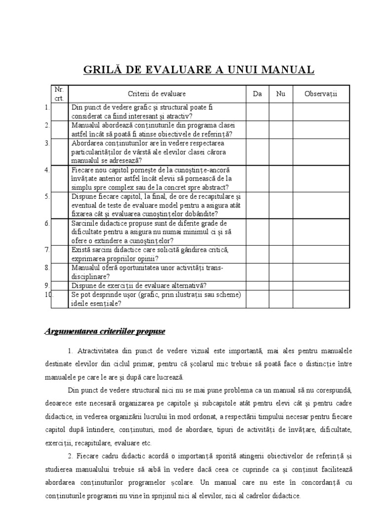 Grila De Evaluare A Unui Manual Doc