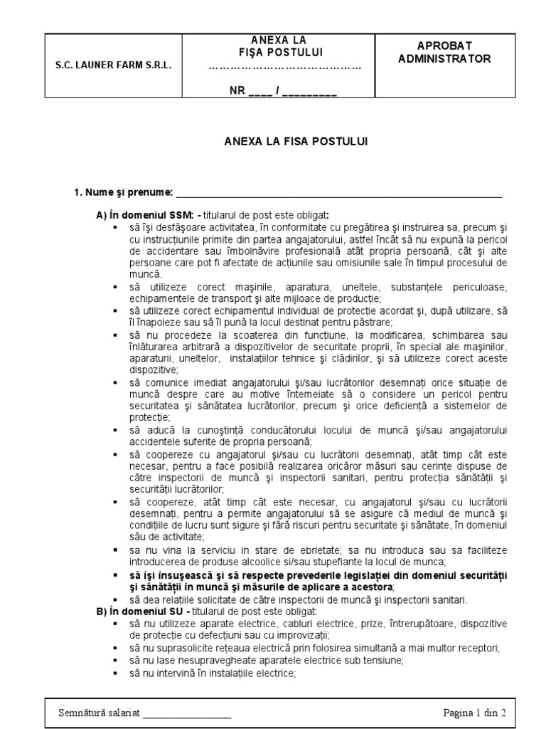 Anexa La Fisa Postului Privind Ssm Si Psi