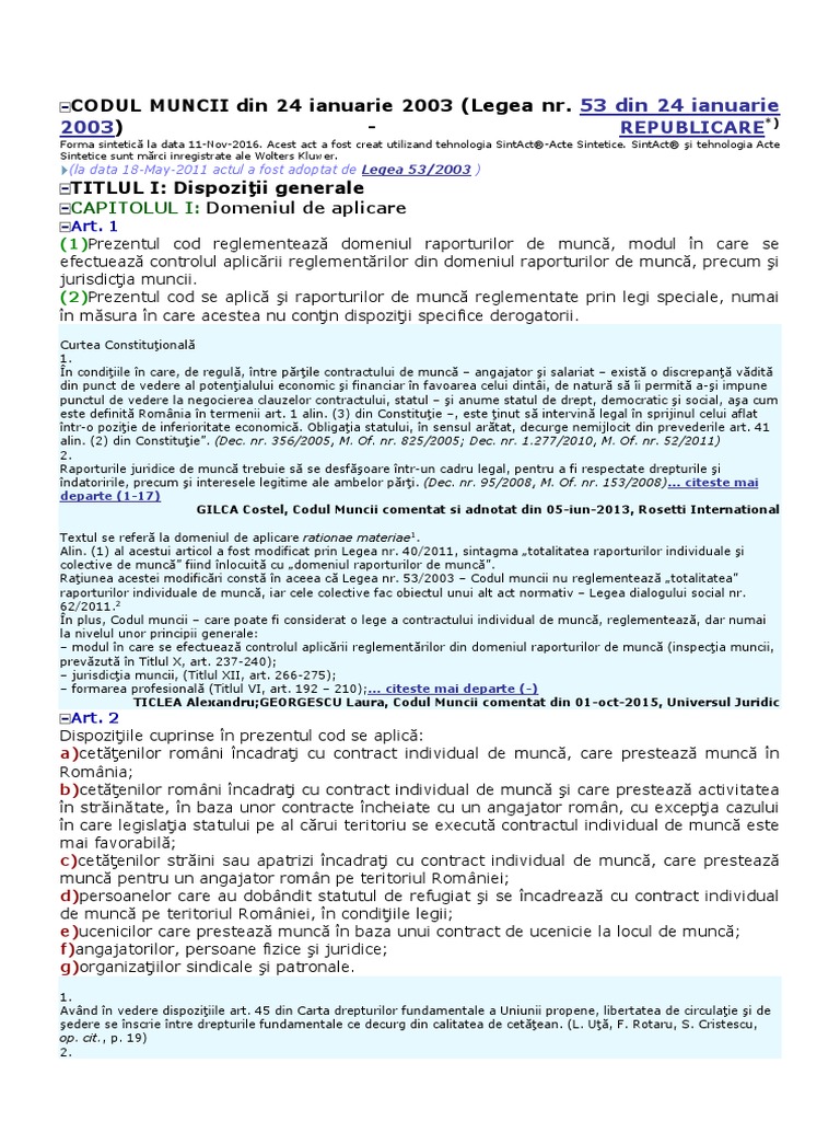Codul Muncii Legea 53 2003 Republicata 2011 La 11 11 2016