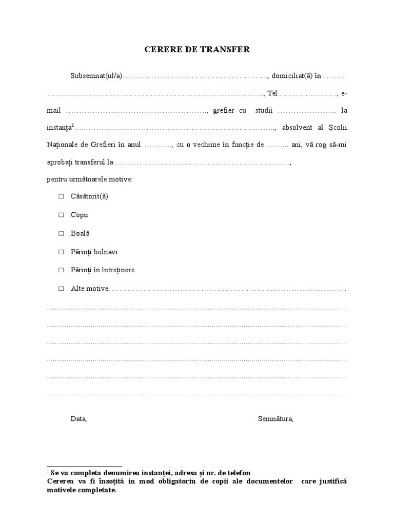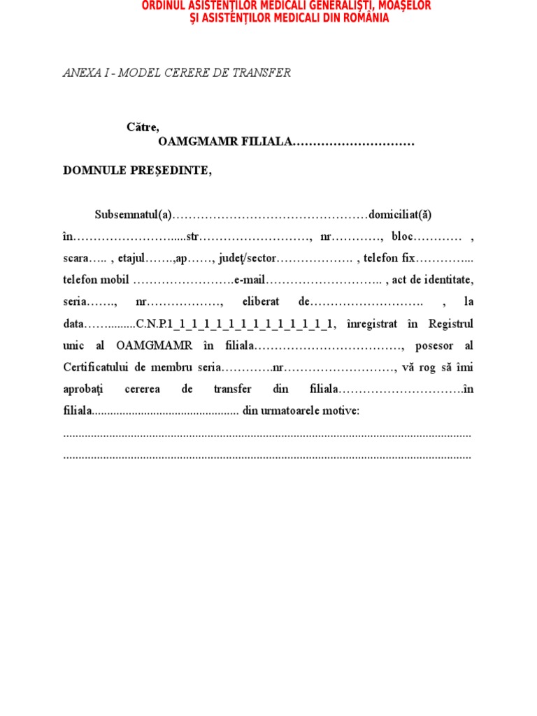 Model Cerere Transfer Elevi școala Gimnazială Comuna Tinosu