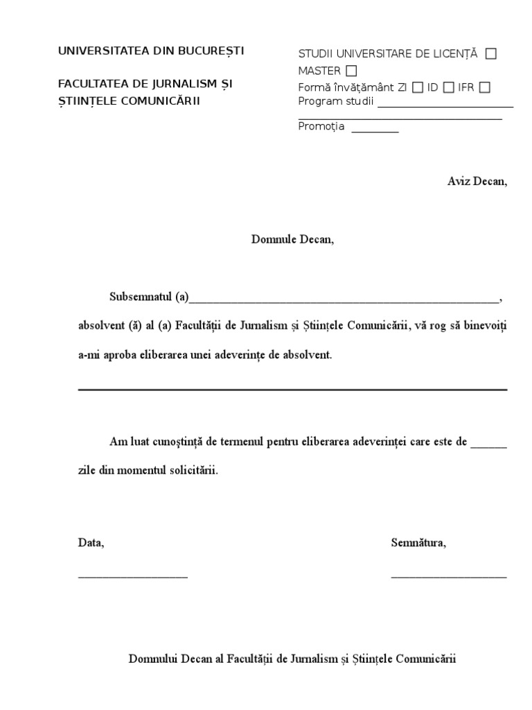 Cerere Pentru Eliberarea Adeverintei De Absolvent Fara Examen De Licenta Sau Disertatie