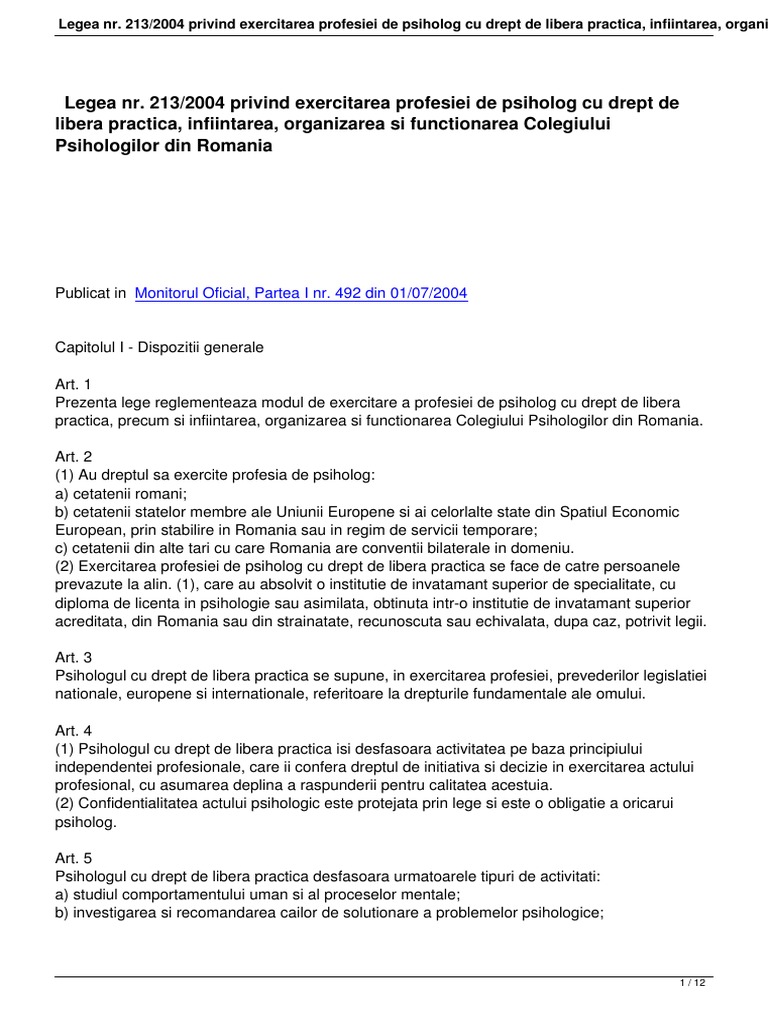 Legea Nr 213 2004 Privind Exercitarea Profesiei De Psiholog Cu Drept De Libera Practica Infiintarea Organizarea Si Functionarea Colegiului Psihologilor Din Romania