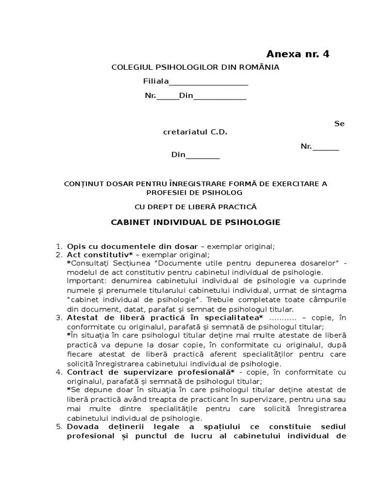 Continut Dosar Inregistrare Cabinet Individual De Psihologie