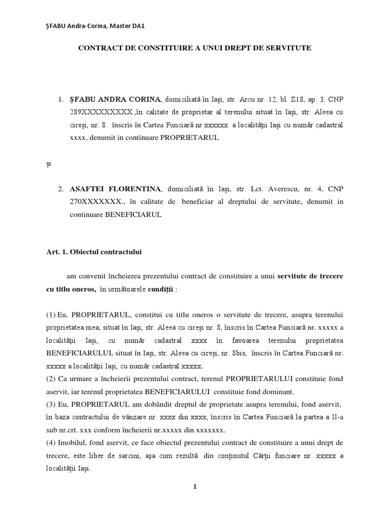 Contract De Constituire A Unui Drept De Servitute