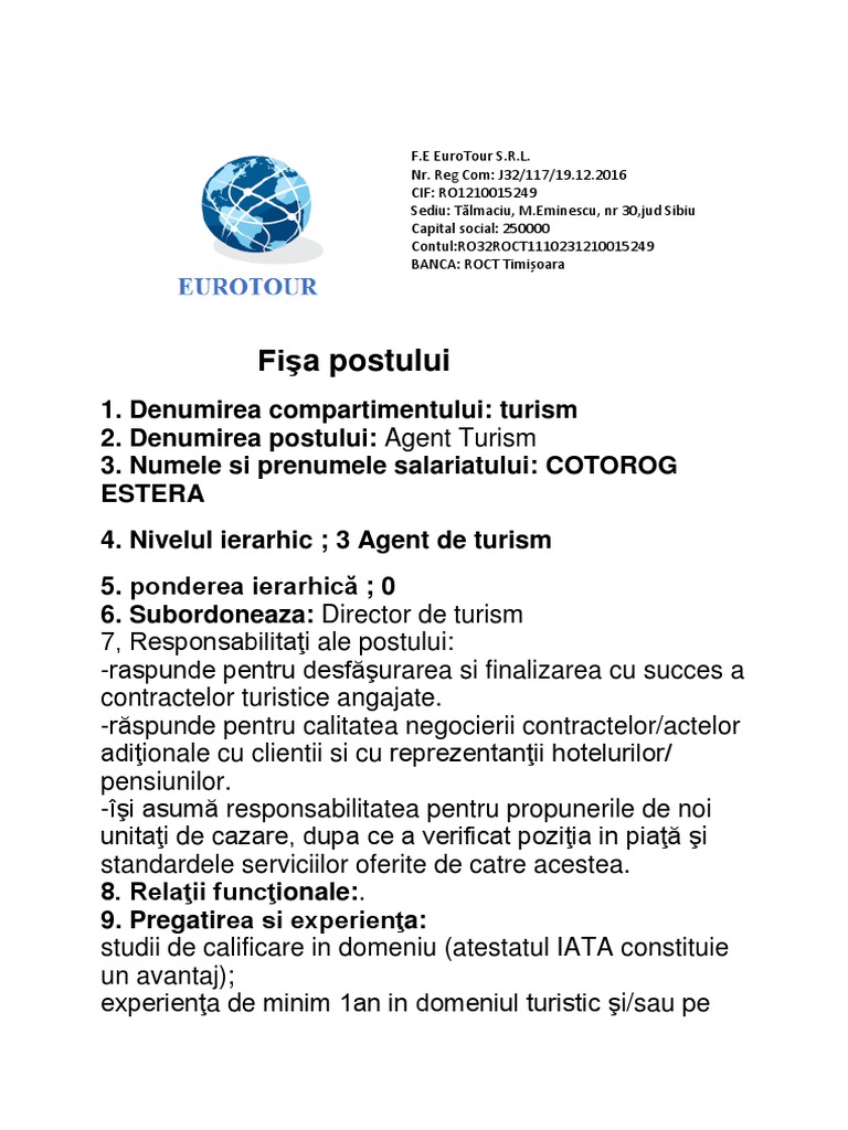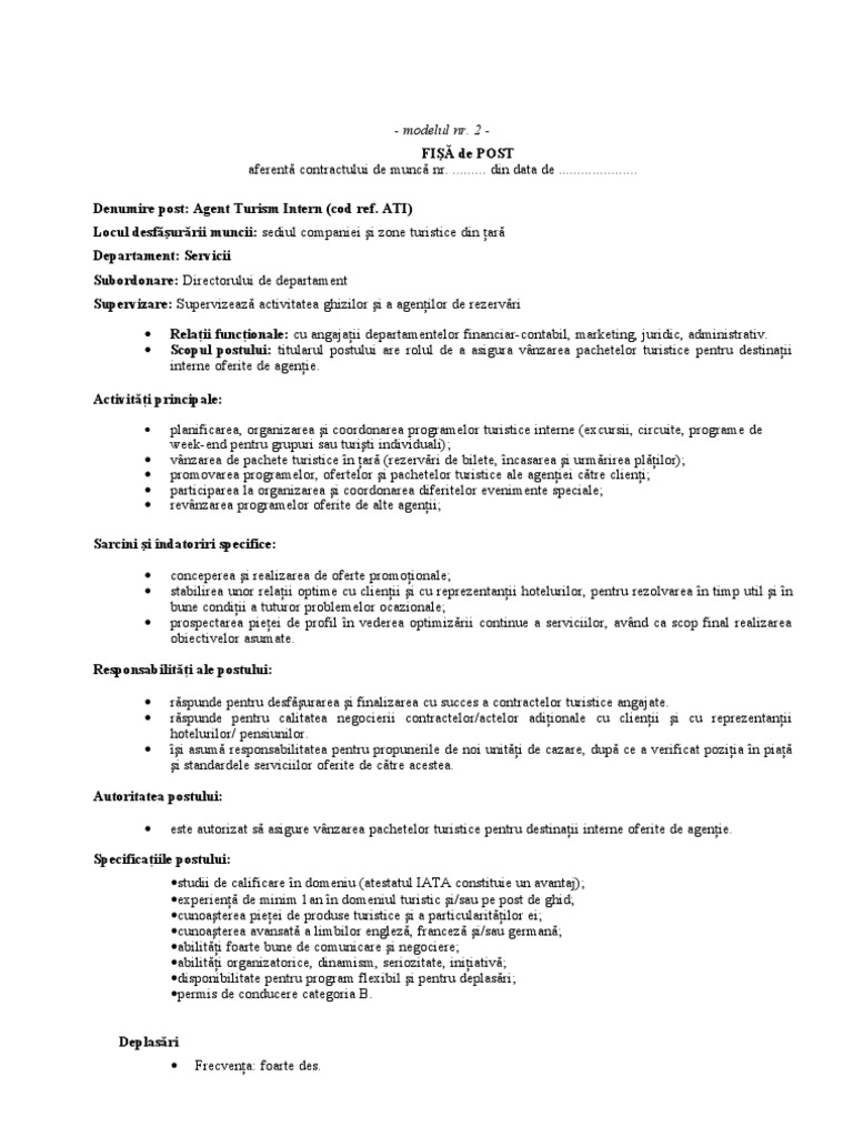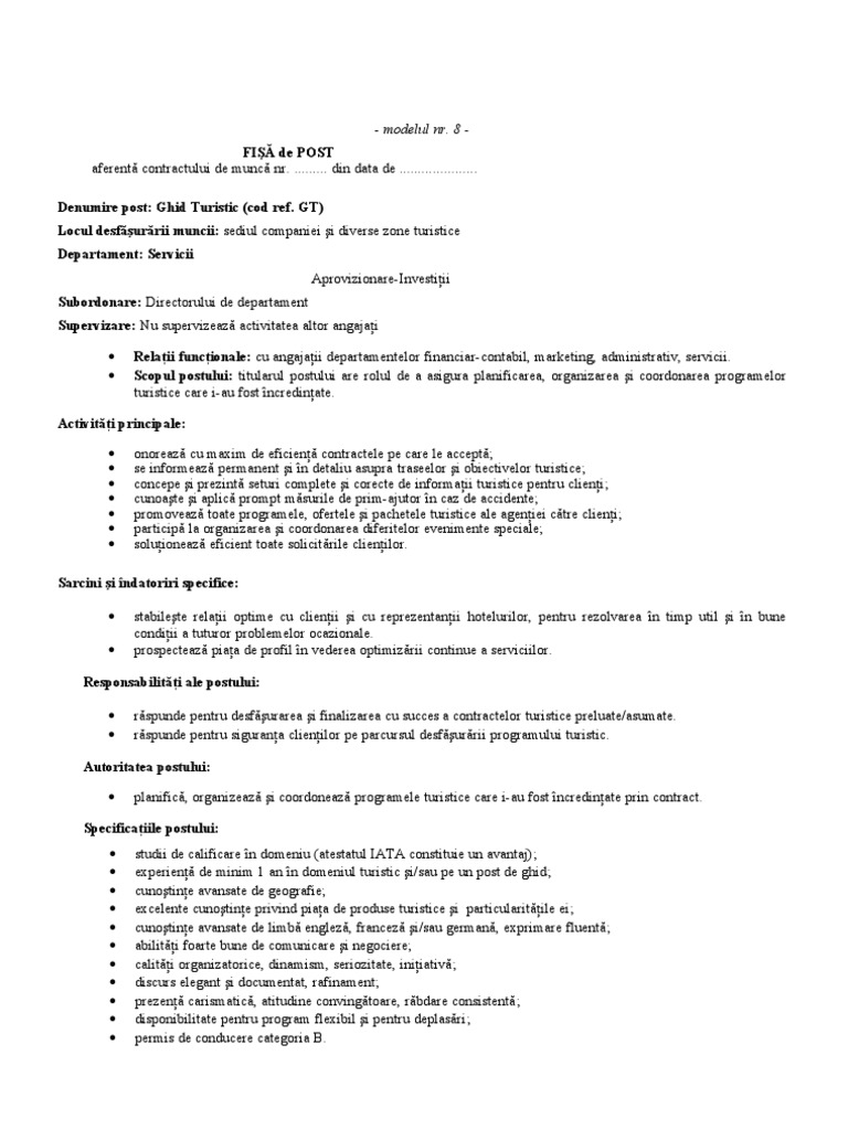 Respecta toate punctele prevazute in fisa postului. Fisa postului manager in activitatea de turism. We would like to show you a description here but the site won t allow us. Aceasta postare a fost editata de alupei otilia.
