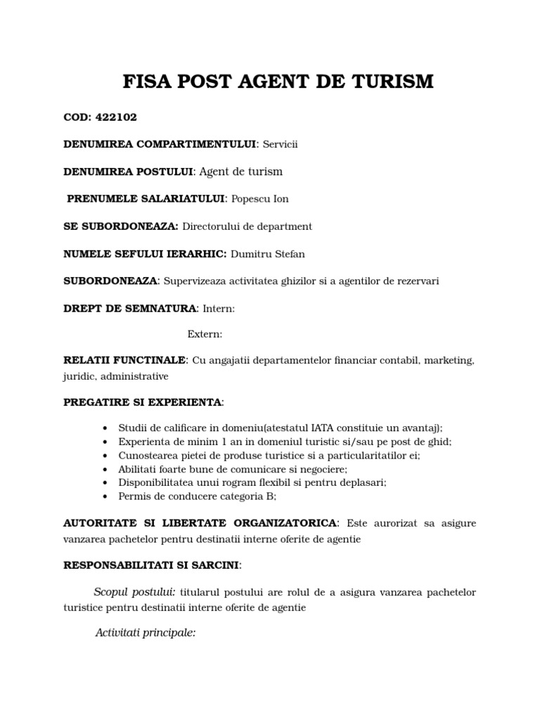Cine ma poate ajuta cu fisa postului pentru. Fisa postului director hotel motel hotel pentru tineret hostel camping sat de vacanta popas turistic. Procesul de cumpărare a pachetului turistic. Agent turism extern 3.