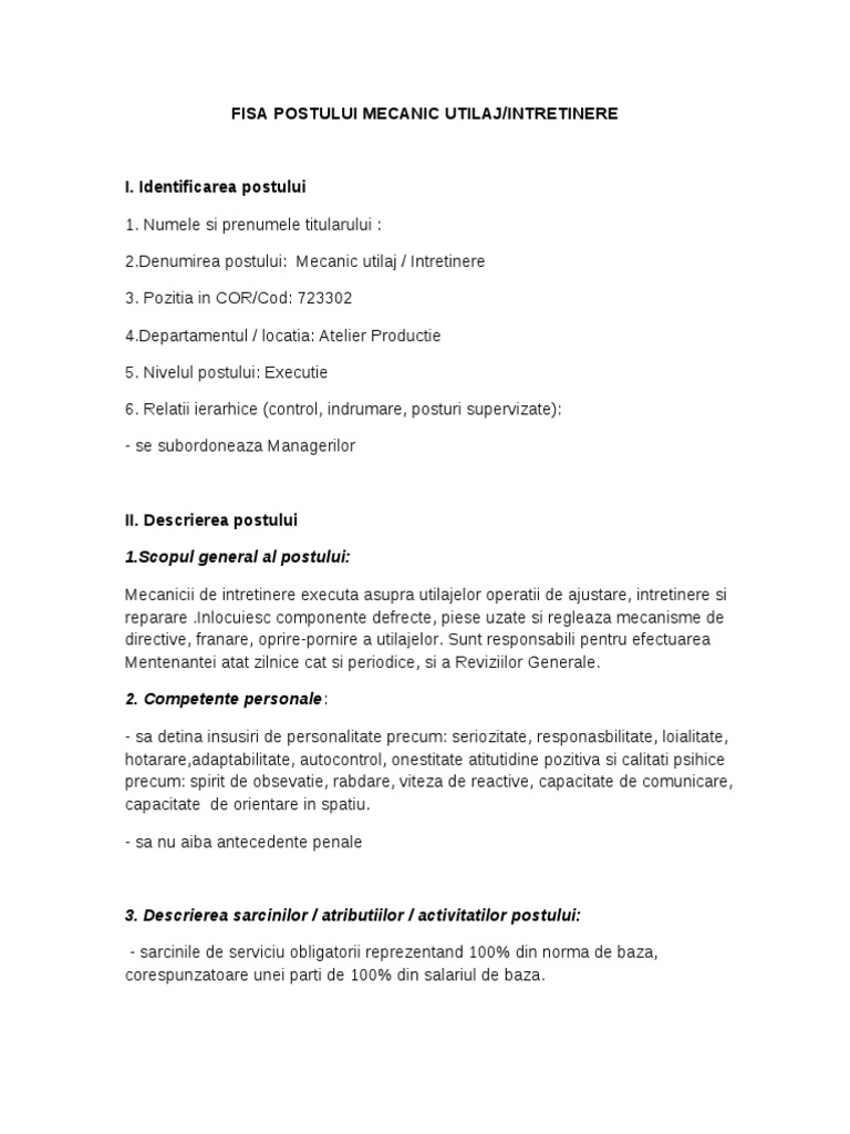 Fisa De Post Mecanic Intretinere
