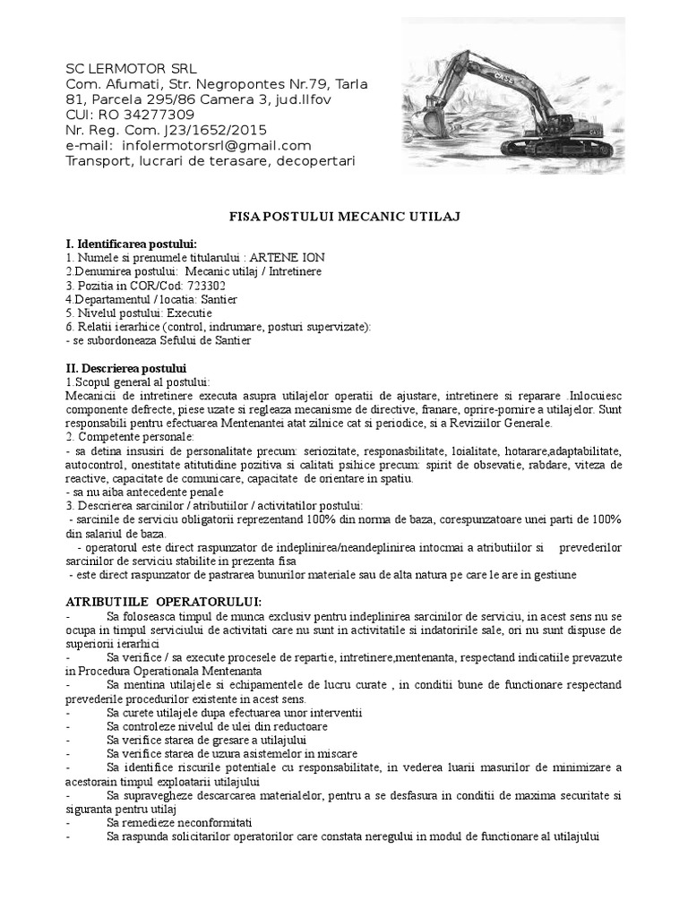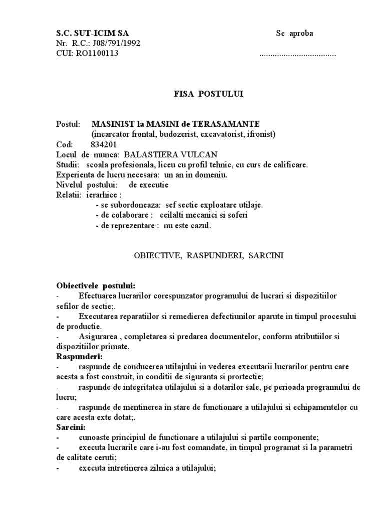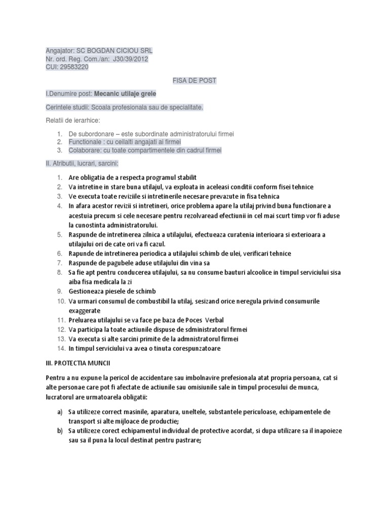 Fisa Post Mecanic Utilaj Pdf Document