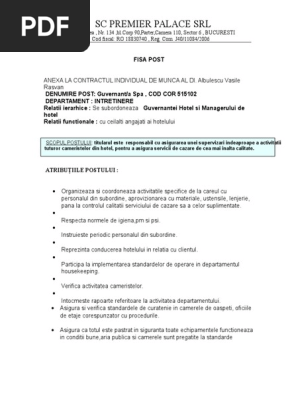 Fișa Postului și Fișă De Evaluare A Performanțelor Individuale Pentru Cameristă Hotel Cod Cor 516201