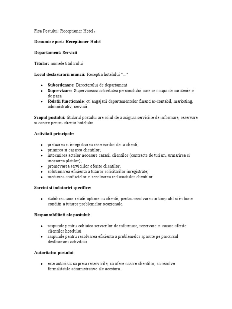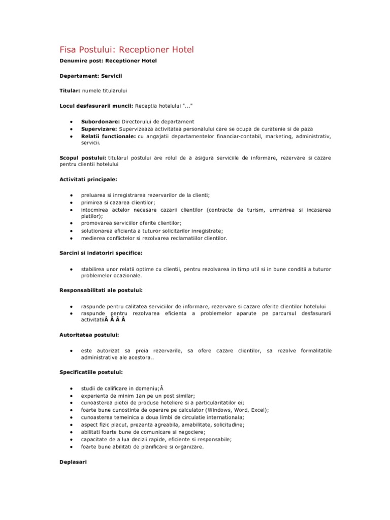 Proiect Fisa Postului De Receptioner Hotel Scala Turism 212831