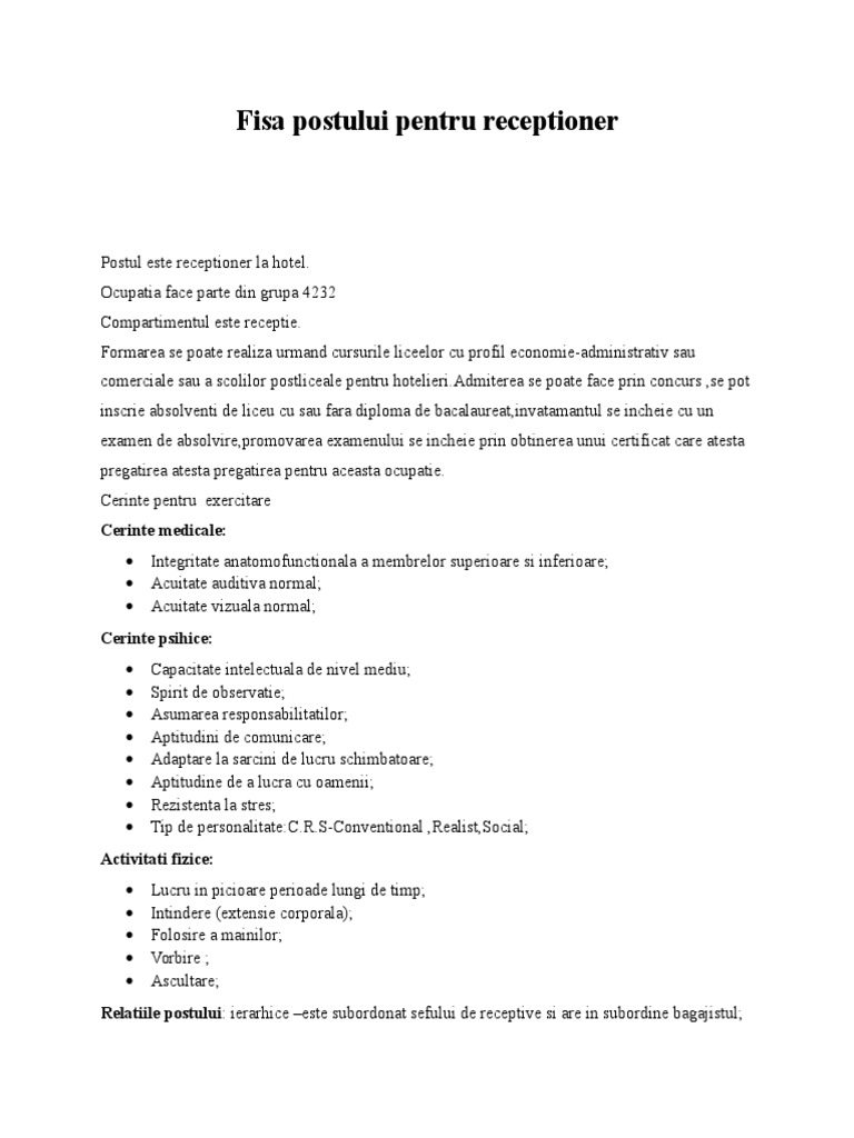 Fisa Postului Pentru Receptioner Cerinte Medicale