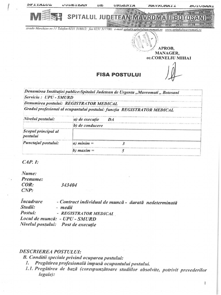 Fisa Postului Registrator Medical Upu Smurd Pdf 1