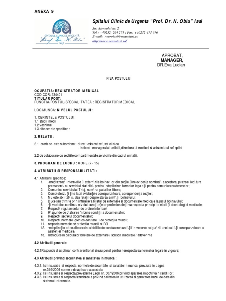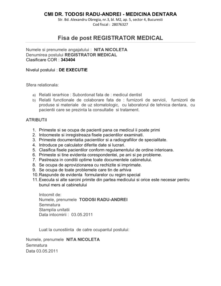 Fisa Postului Registrator Medical Cpu S Pdf Google Drive