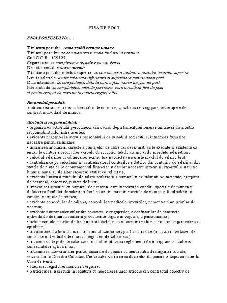 Model Fisa De Post Pentru Inspector Resurse Umane Docx