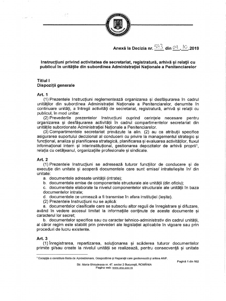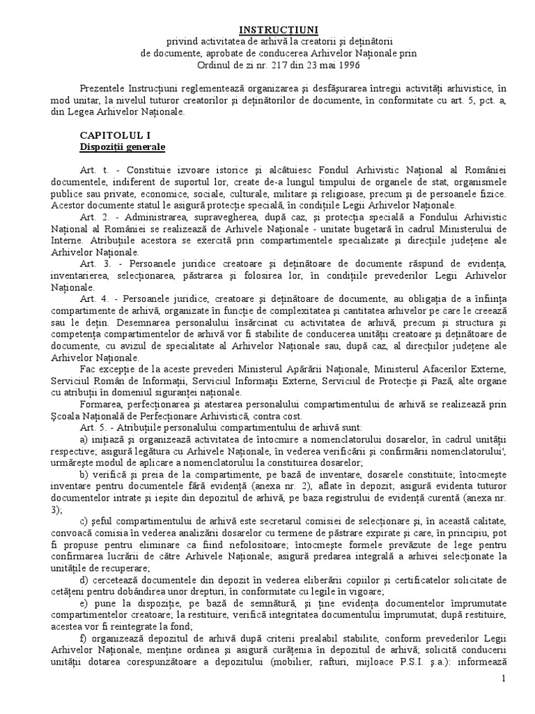 Instrucţiuni Privind Activitatea De Arhivă La Creatorii Si Deţinătorii De Documente Aprobate De Conducerea Arhivelor Naţionale Prin Ordinul De Zi Nr 217 Din 23 Mai 1996