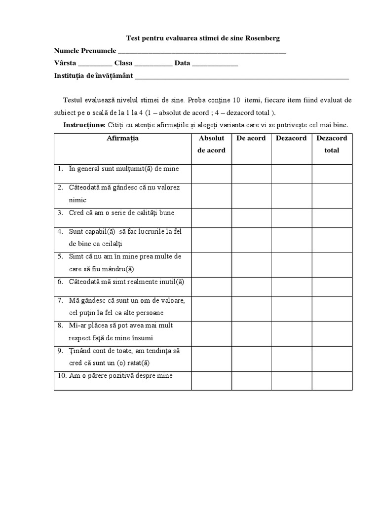 Test Pentru Evaluarea Stimei De Sine Rosenberg