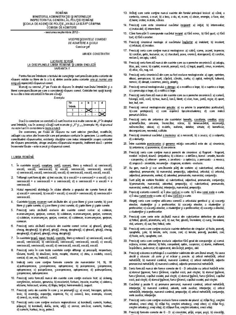 2015 Subiecte Admitere Subiecte Romania Ministerul Afacerilor Interne Inspectoratul General Al Politiei Romane Scoala De Agenti De Politie Septimiu Mure An Cluj Napoca Comisia
